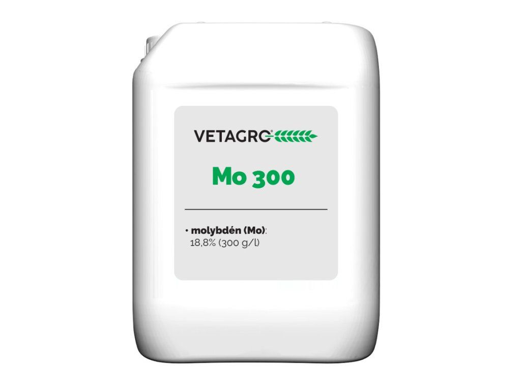 Mo 300 je kvapalné hnojivo s obsahom organického komplexu molybdénu (Mo), určené na foliárnu aplikáciu. Molybdén (Mo) je mimoriadne dôležitým stopovým prvkom v procese fixácie dusíka. Stimuláciou syntézy chlorofylu zosilňuje fotosyntézu, zvyšuje obsah škrobu a zrýchlením redukcie dusičnanov a syntézy proteínov zvyšuje obsah bielkovín v zrne, resp. plodoch rastlín. Molybdén je dôležitým stopovým prvkom pre mnohé rastliny. Má pozitívny vplyv na rast obilnín, olejnín, strukovín a okopanín. Strukoviny vyžadujú pre normálny rast väčší prísun molybdénu ako iné druhy. Baktérie viažuce dusík v koreňoch strukovín využívajú molybdén na fixáciu dusíka zo vzduchu. Hnojenie molybdénom teda zvyšuje absorpciu dusíka v koreňoch strukovín. Nedostatok tohto prvku sa vyskytuje v kyslých a ľahkých pôdach. Na využiteľnosť molybdénu negatívne vplývajú nízke teploty a vysoké dávky dusíkatých hnojív.
